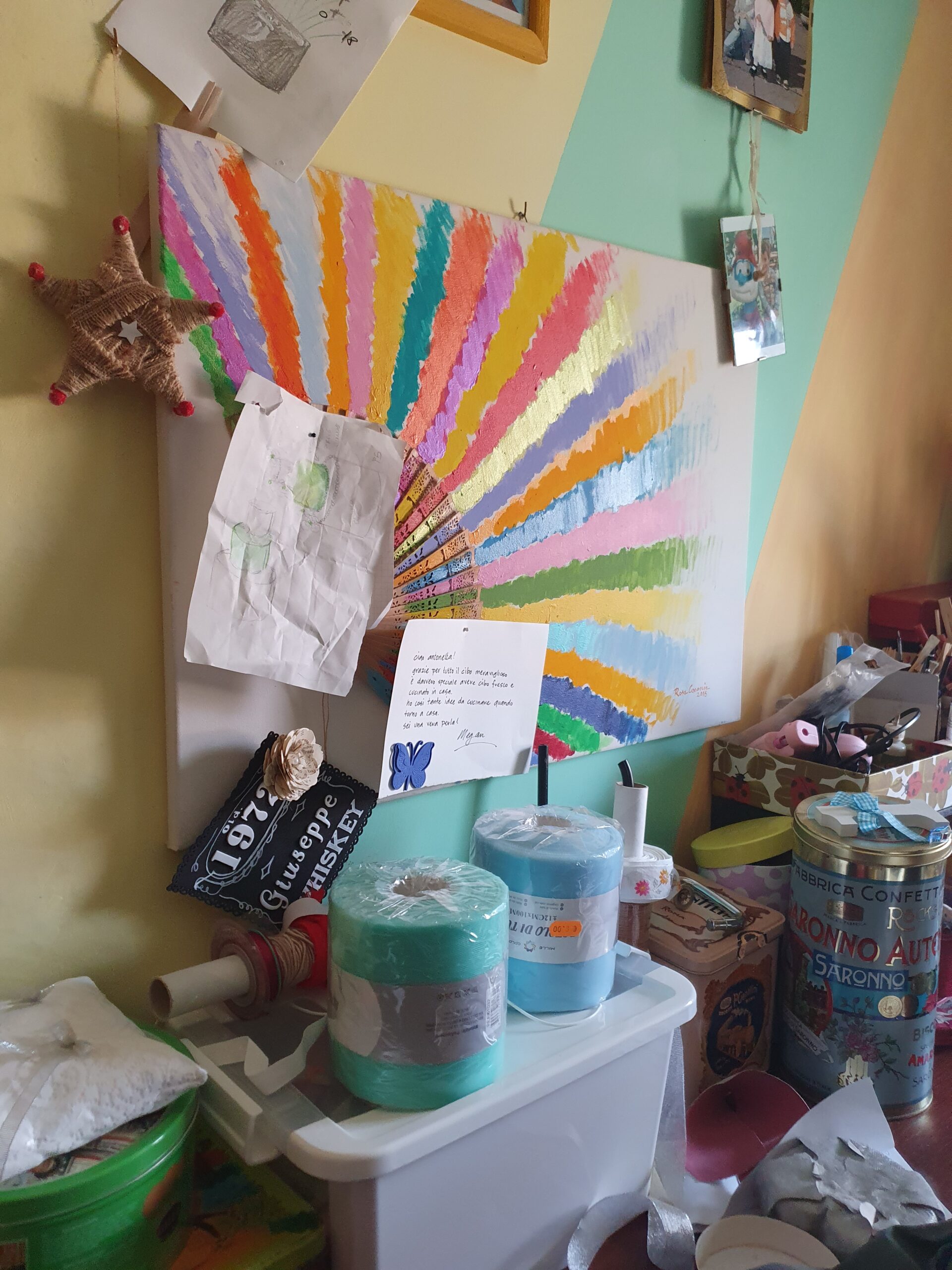 Ciao, ormai stiamo insieme da 14 anni. Quante me ne hai fatte passare! Però devo dirti che ormai i tuoi capricci li ho capiti e non ti temo più. Oggi non ti vuoi alzare? Va bene. Programmo, risvolto, addolcisco la giornata. Mi rifugio nella mia stanza colorata, mi siedo e lavoro un pochino: un po’ per esigenza, un po’ perché mi piace. Quale macchina vuoi oggi? La taglia e cuci? La macchina da cucire che si chiama Vanda? O Zia? Ogni macchina da cucire mi è stata donata e porta il nome di chi l’aveva prima di me. Le amo: sono il mio rifugio. La mia stanza, creata ad arte dai miei figli e da mio marito, con il mio disordine, il caos che prende il sopravvento. Stoffe colorate, fili colorati, pareti dai colori delicati: mi fanno sentire al sicuro, dentro una cassetta degli affetti. Oggi c’è il sole. Oggi mi sento stanca. Oggi mi trovate nella mia stanza. La primavera si sente nell’aria e facciamo uscire cotoni colorati e bellissime stampe di fiori. Facciamo tovagliette? Oppure vogliamo fare le gallinelle? O cestini? O borse? Boh, vediamo… intanto ci prepariamo per la Pasqua. Io ho bisogno della mia stanzetta e ringrazio i miei che mi hanno sempre assecondata. Oltre a cucire amo creare con la gomma EVA: farfalle, fiori, gnomi. Uso il tempo che la mia “inquilina” mi concede da seduta per dedicarmi a qualcos’altro. All’inizio non riuscivo, ma oggi riesco a fare tutto quello che credevo di non poter fare più: usare e osare nella creatività, dare forza a una piccola mancanza. Amo la mia Cassetta degli affetti. Ciao.